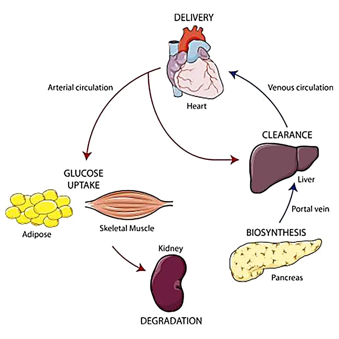 胰岛是胰腺内的一些细胞团,其中β细胞占胰岛细胞的大部分。当血糖升高时,β细胞被刺激,合成并释放胰岛素到血液中,以调节血糖水平[1]。胰岛素是最重要的合成代谢激素,它的合成和作用在其身体不同器官中受到巧妙的调节。从胰腺β细胞的产生开始,到肝细胞部分清除,然后在血管内皮的传递及其在大脑、肌肉纤维和脂肪细胞(主要作用部位)的作用,最后在肾脏中被降解,如下图所示[1-2]